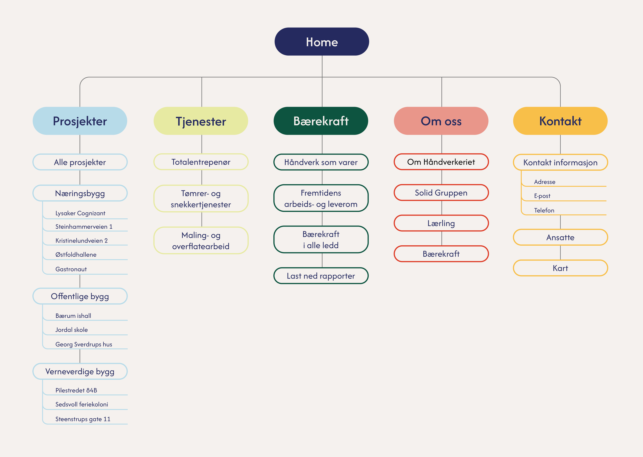 Den eksisterende nettsiden var lite brukervennlig, og tungvindt for brukeren å navigere seg rundt. Dette var noe vi ønsket å forbedre, derfor satt vi opp en sitemap som vi presenterte for kunden.